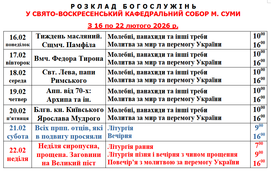 Розклад Богослужінь у Свято-Воскресенському кафедральному соборі м. Суми з 16 по 22 лютого 2026 року