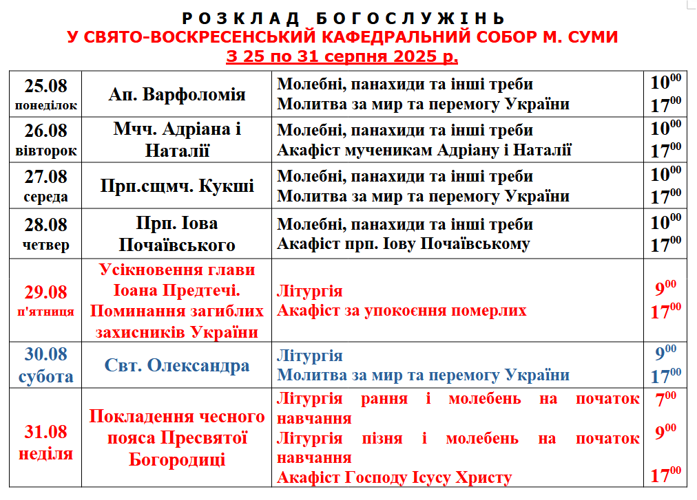 Розклад Богослужінь у Свято-Воскресенському кафедральному соборі м. Суми з 25 по 31 серпня 2025 року