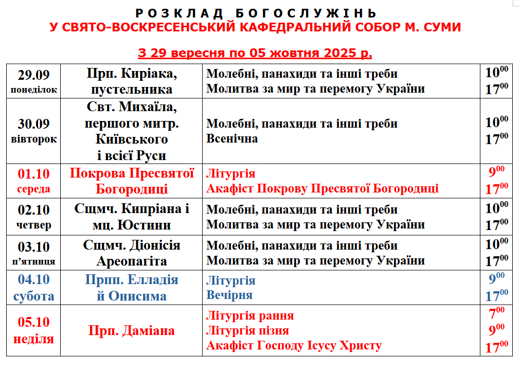 Розклад Богослужінь у Свято-Воскресенському кафедральному соборі м. Суми з 29 вересня по 5 жовтня 2025 року