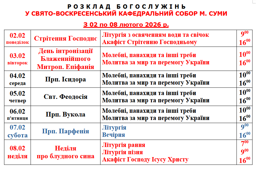Розклад Богослужінь у Свято-Воскресенському кафедральному соборі м. Суми з 2 по 8 лютого 2026 року