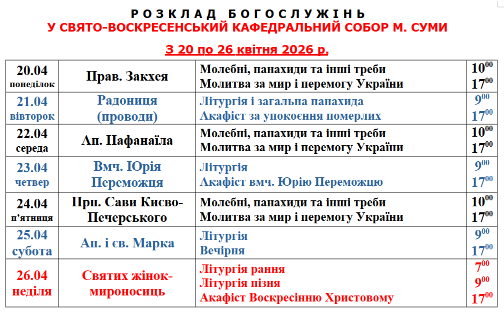 Розклад Богослужінь у Свято-Воскресенському кафедральному соборі м. Суми з 20 по 26 квітня 2026 року
