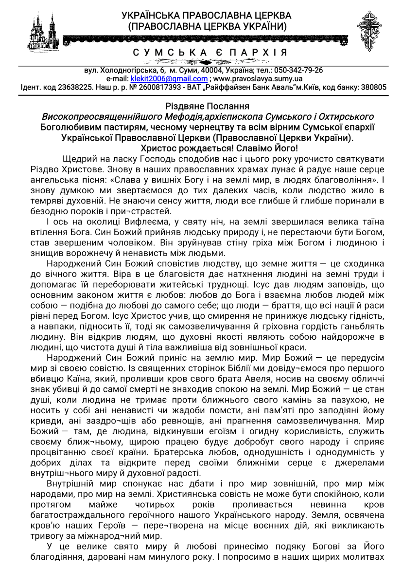 Різдвяне Послання Високопреосвященнійшого Мефодія,архієпископа Сумського і Охтирського