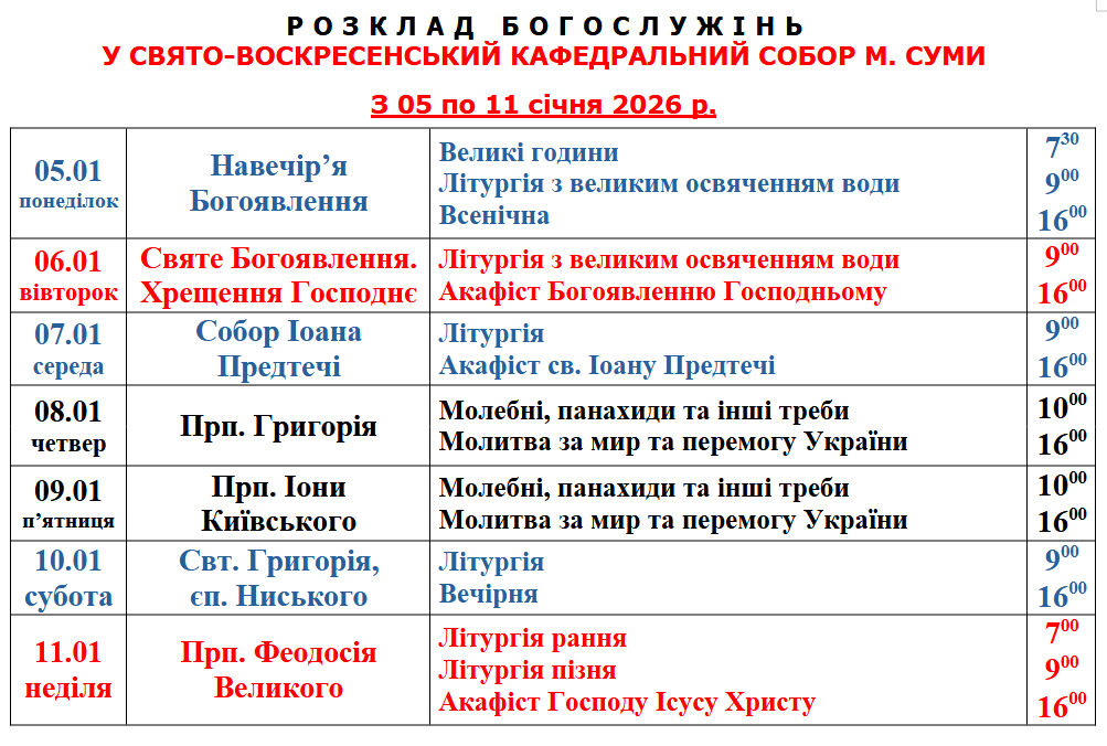 Розклад Богослужінь у Свято-Воскресенському кафедральному соборі м. Суми з 5 по 11 січня 2026 року