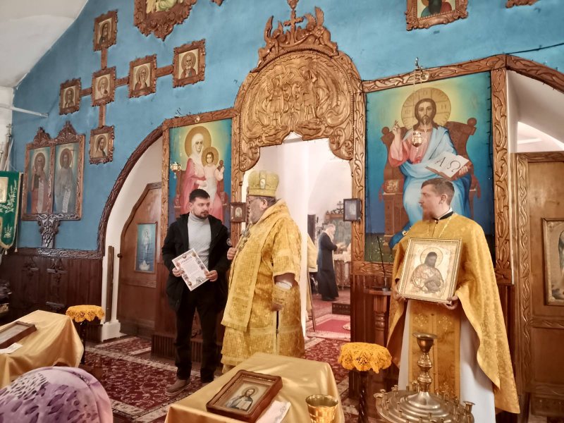 Після проповіді владика Мефодій відзначив волонтера церковною відзнакою. Керівник та учні іконописної школи подарували владиці Мефодію написані учнями школи чудові ікони.