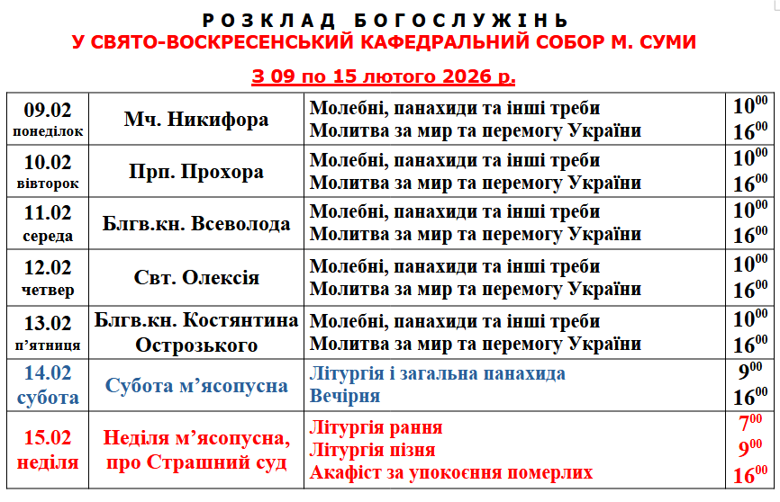 Розклад Богослужінь у Свято-Воскресенському кафедральному соборі м. Суми з 9 по 15 лютого 2026 року