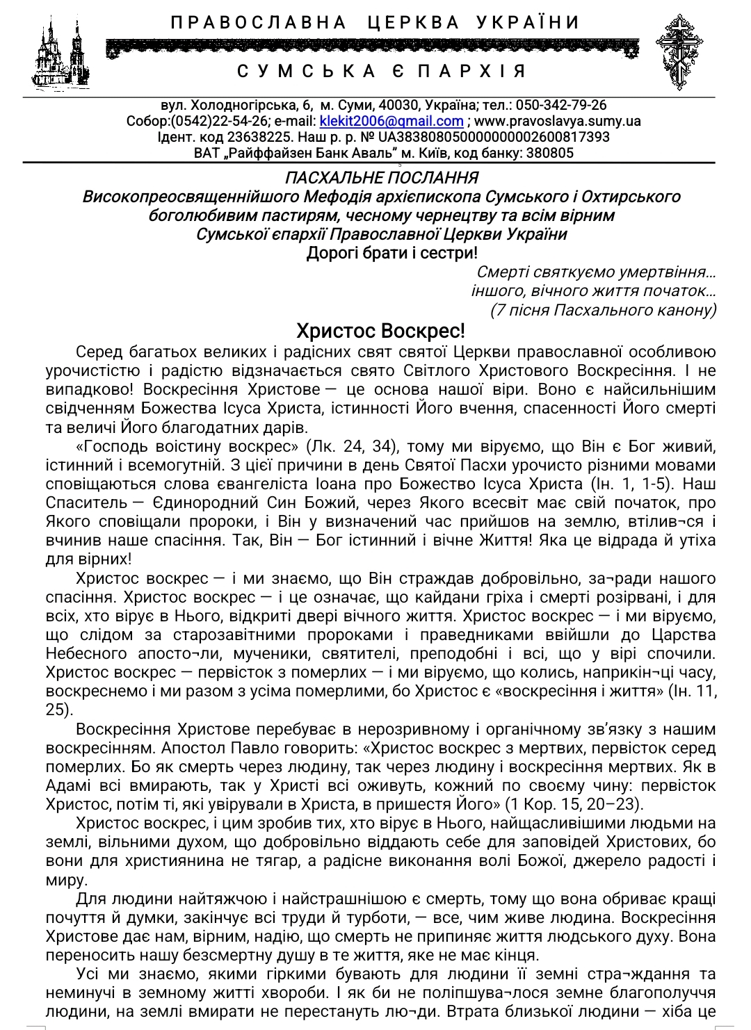 Пасхальне послання Високопреосвященнійшого Мефодія архієпископа Сумського і Охтирського боголюбивим пастирям, чесному чернецтву та всім вірним Сумської єпархії Православної Церкви України