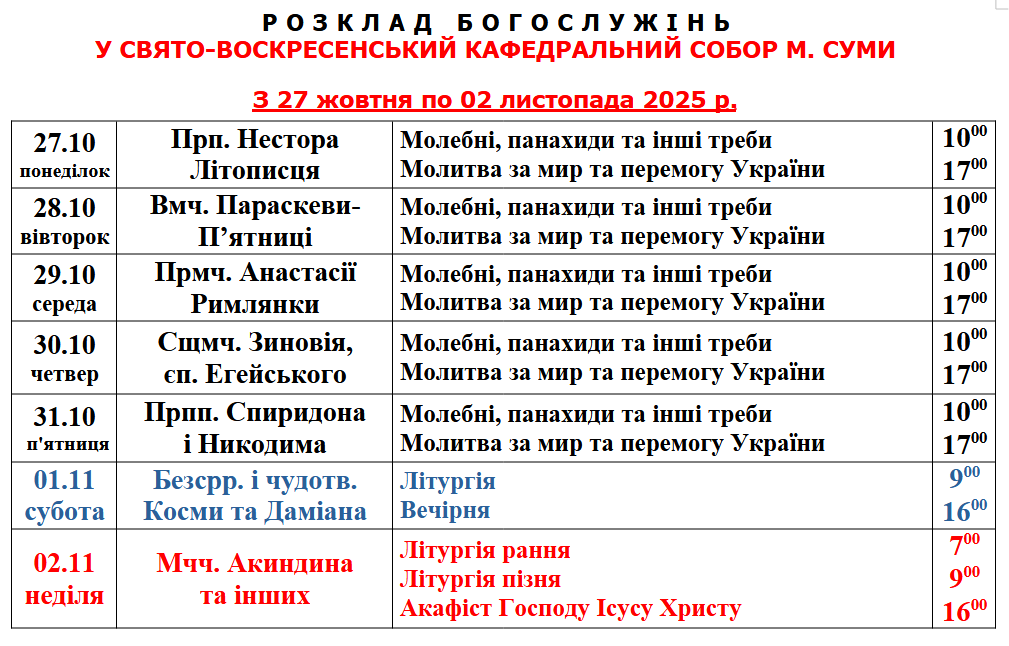 Розклад Богослужінь у Свято-Воскресенському кафедральному соборі м. Суми з 27 жовтня по 2 листопада 2025 року