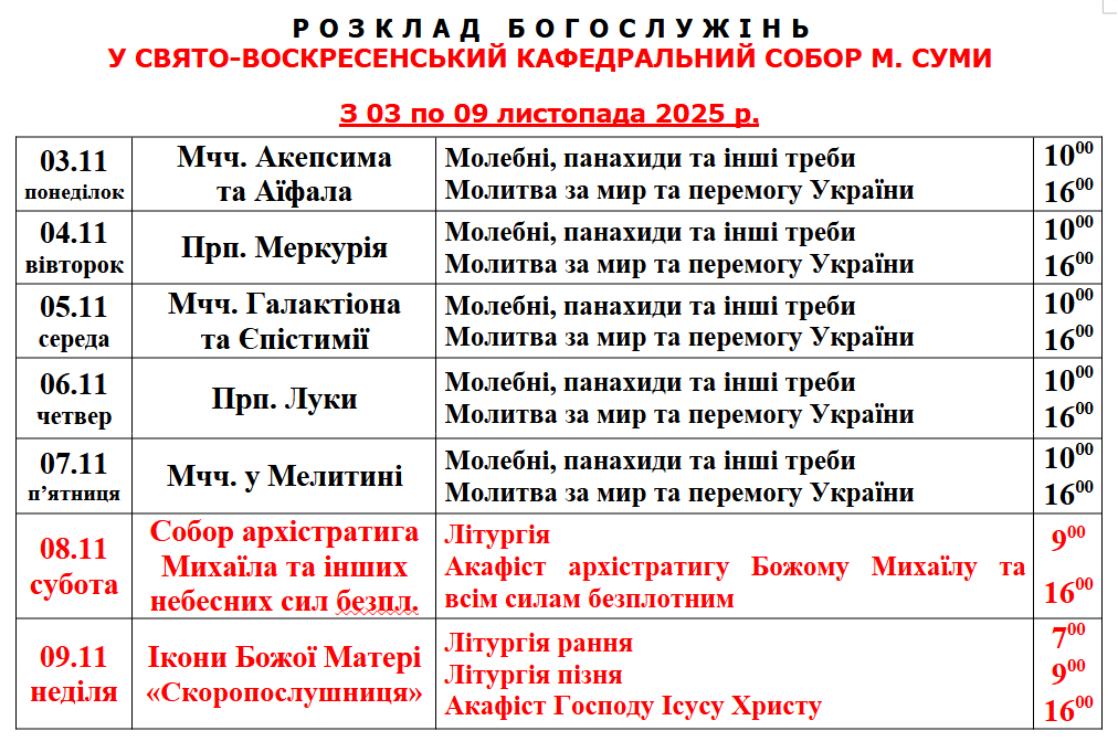 Розклад Богослужінь у Свято-Воскресенському кафедральному соборі м. Суми з 3 по 9 листопада 2025 року