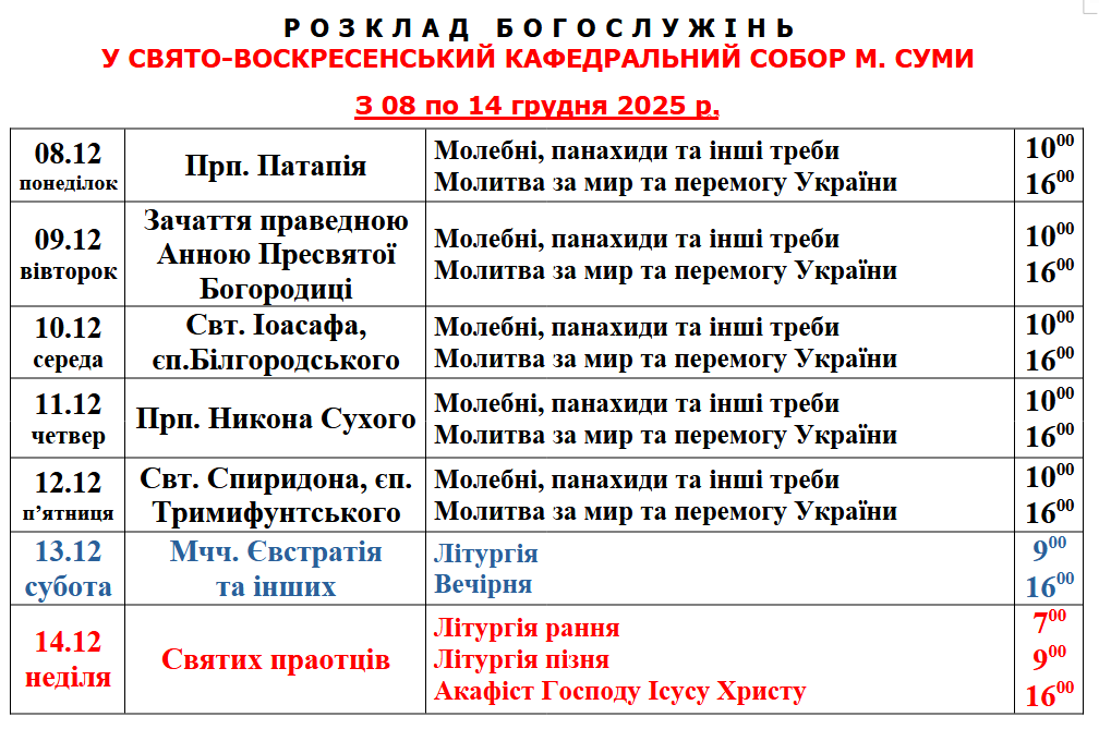 Розклад Богослужінь у Свято-Воскресенському кафедральному соборі м. Суми з 8 по 14 грудня 2025 року