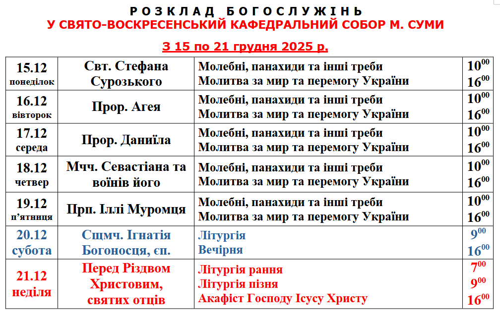 Розклад Богослужінь у Свято-Воскресенському кафедральному соборі м. Суми з 15 по 21 грудня 2025 року