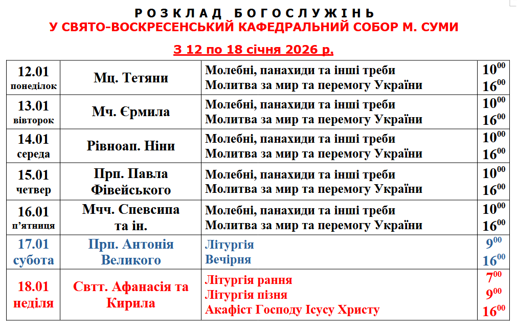 Розклад Богослужінь у Свято-Воскресенському кафедральному соборі м. Суми з 12 по 18 січня 2026 року