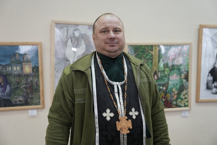 Почався захід із Національної молитви. Її прочитав капелан 117 бригади ТРО отець Сергій. Початок повномасштабної війни, говорить капелан, його застав на Миколаївщині.