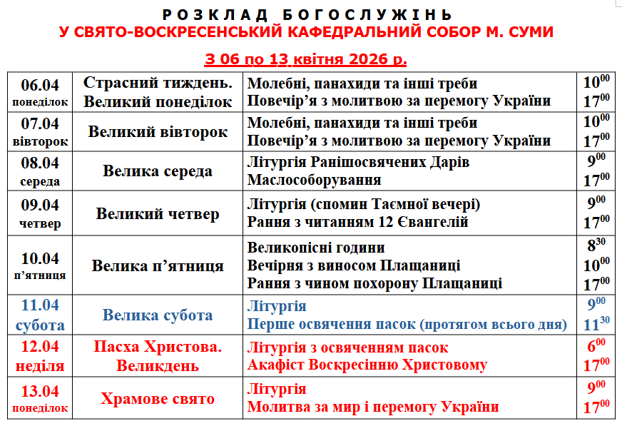 Розклад Богослужінь у Свято-Воскресенському кафедральному соборі м. Суми з 6 по 13 квітня 2026 року