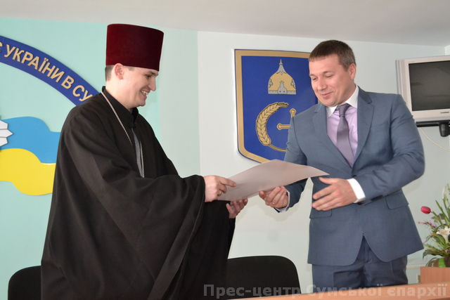 З благословення керуючого Сумської єпархії архієпископа Мефодія на запрошення начальника ДАІ Ейсмонта Олега Уляновича, секретар Сумської єпархії Петро Попадинець з протоієреєм Петро Луцько, привітали працівників ДАІ з професійним святом та вручили благословенні грамоти працівникам.